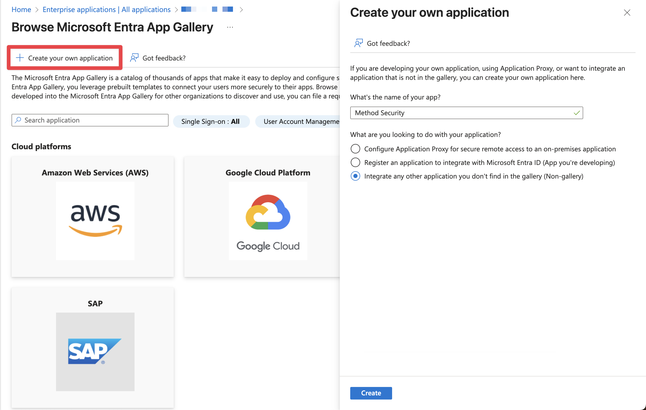 On the Browse Microsoft Entra App Gallery page, select Create your own application, and then Method Platform as the Name.