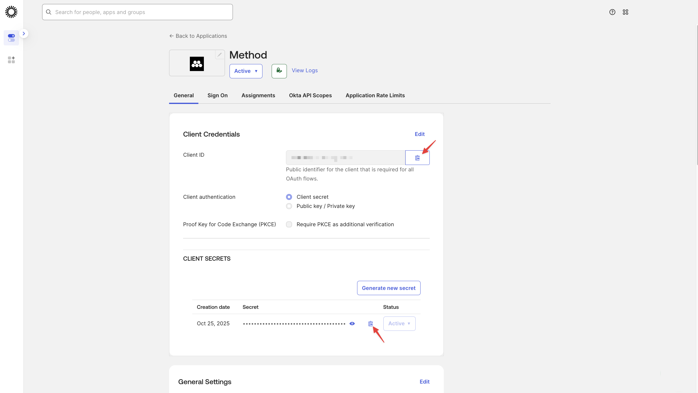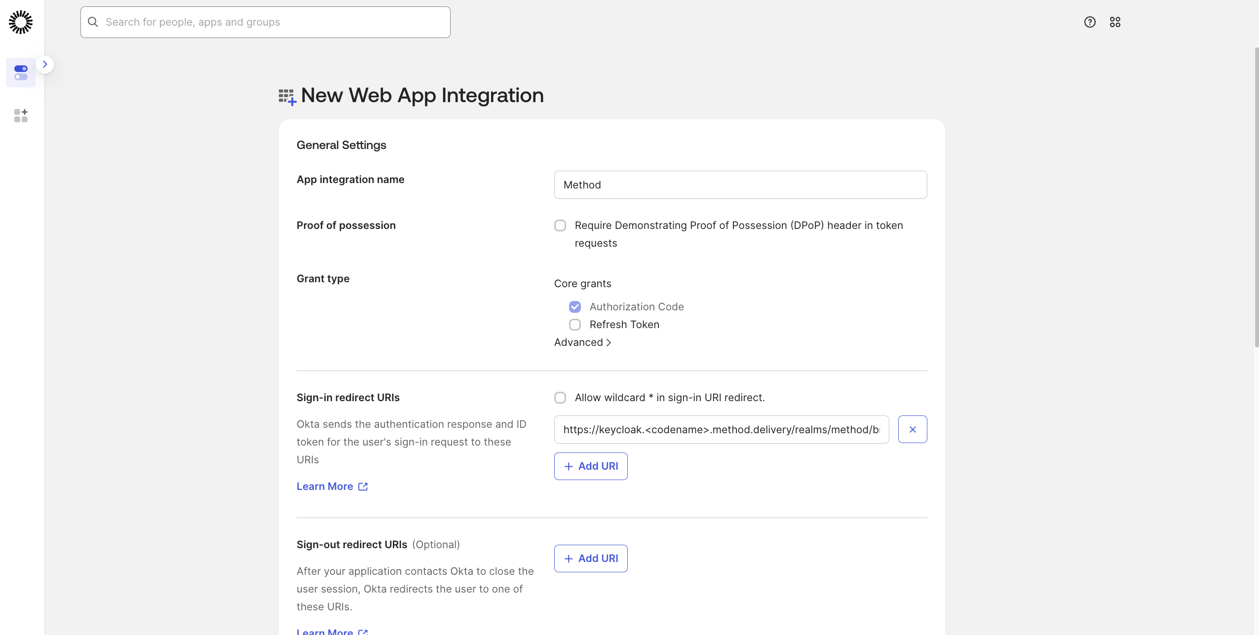 In the Sign-in redirect URIs section, enter the Redirect URI which should be: https://keycloak.<codename>.method.delivery/realms/method/broker/okta/endpoint.
