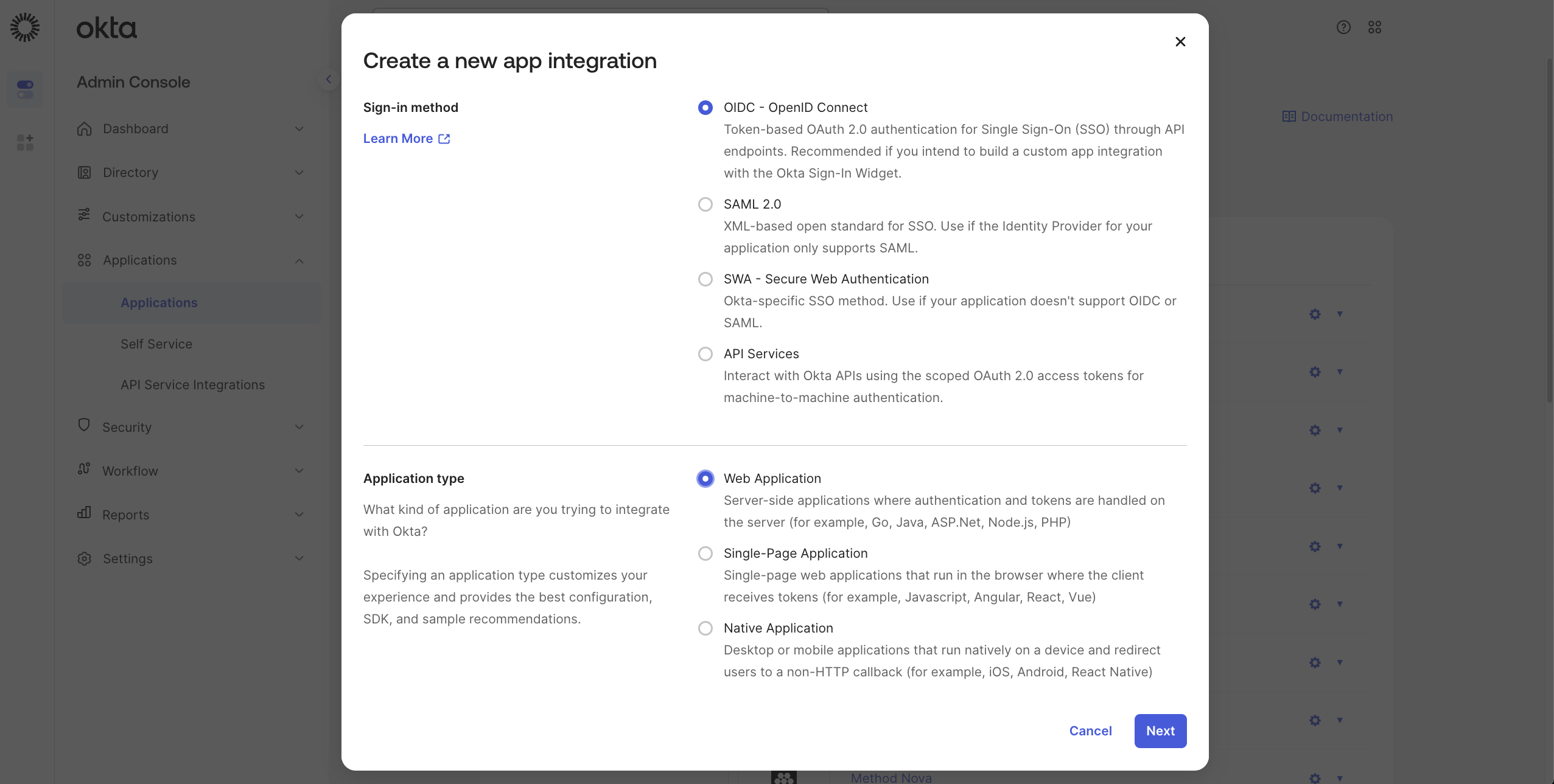 On the Create a new app integration dialog, select OIDC - OpenID Connect as the Sign-in method.