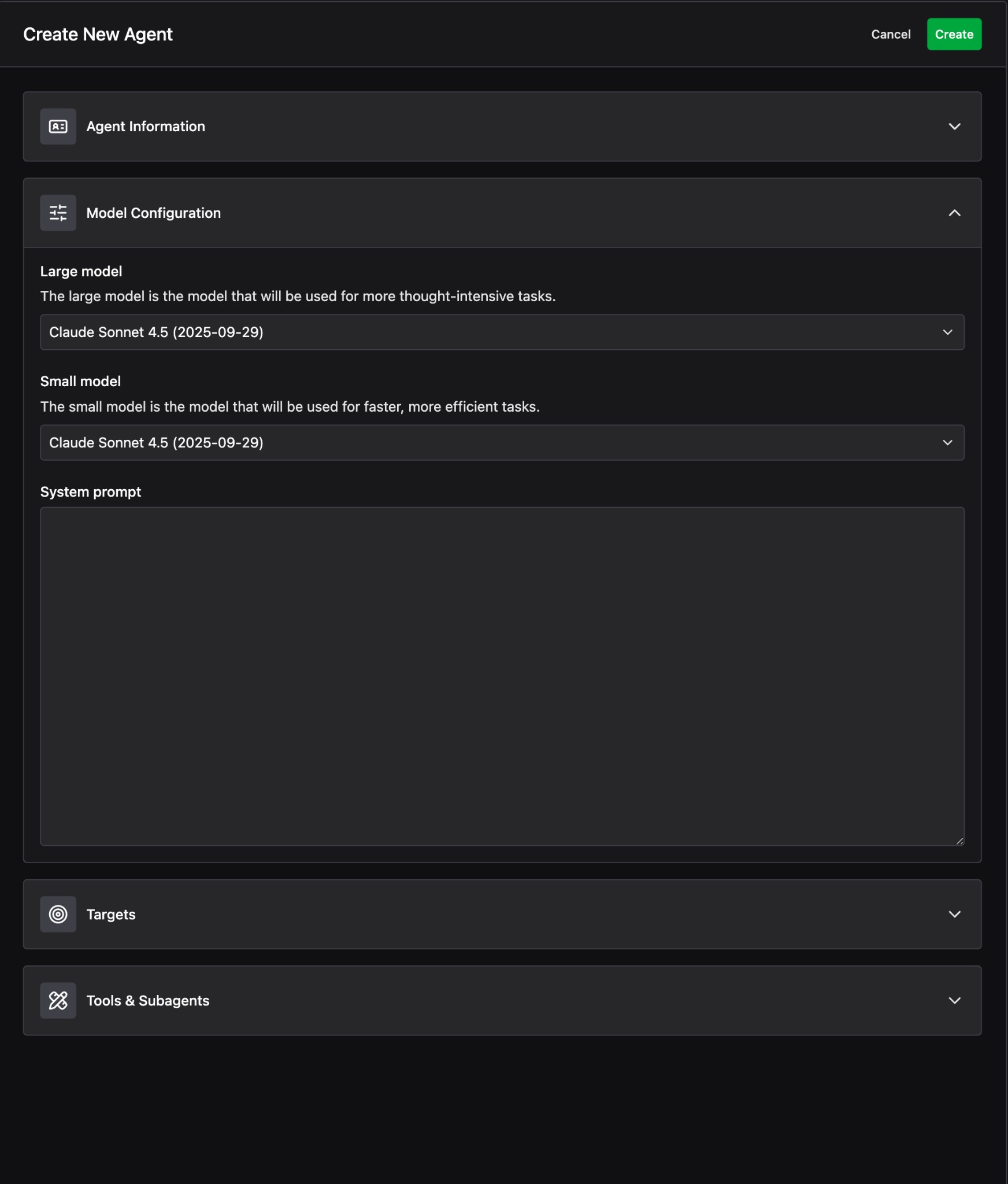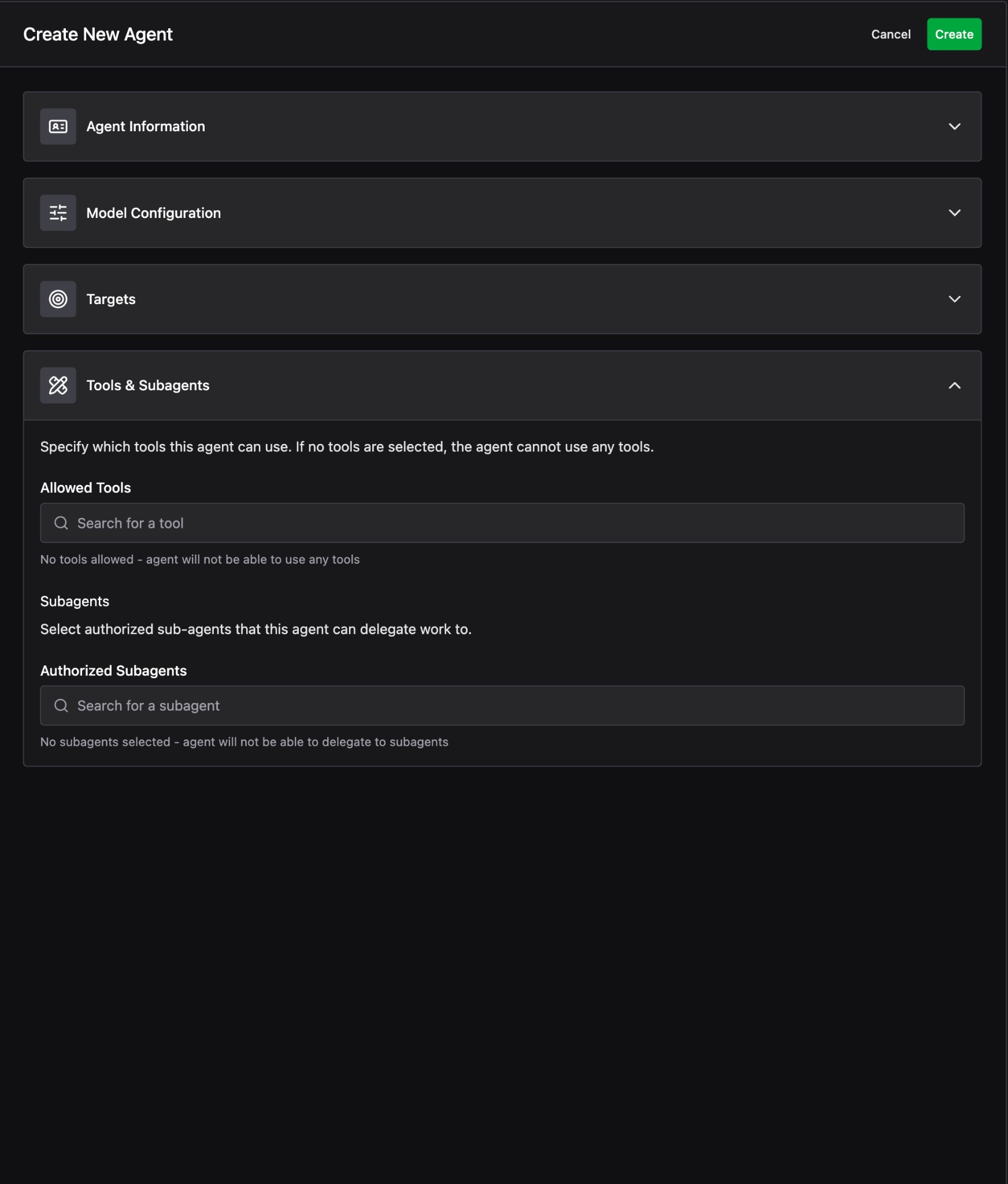 The form has four sections: Agent Information, Model Configuration, Targets, and Tools & Subagents.
