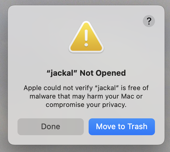 Run the exeuctable with no arguments to ensure that system protections are not going to block the Jackal.