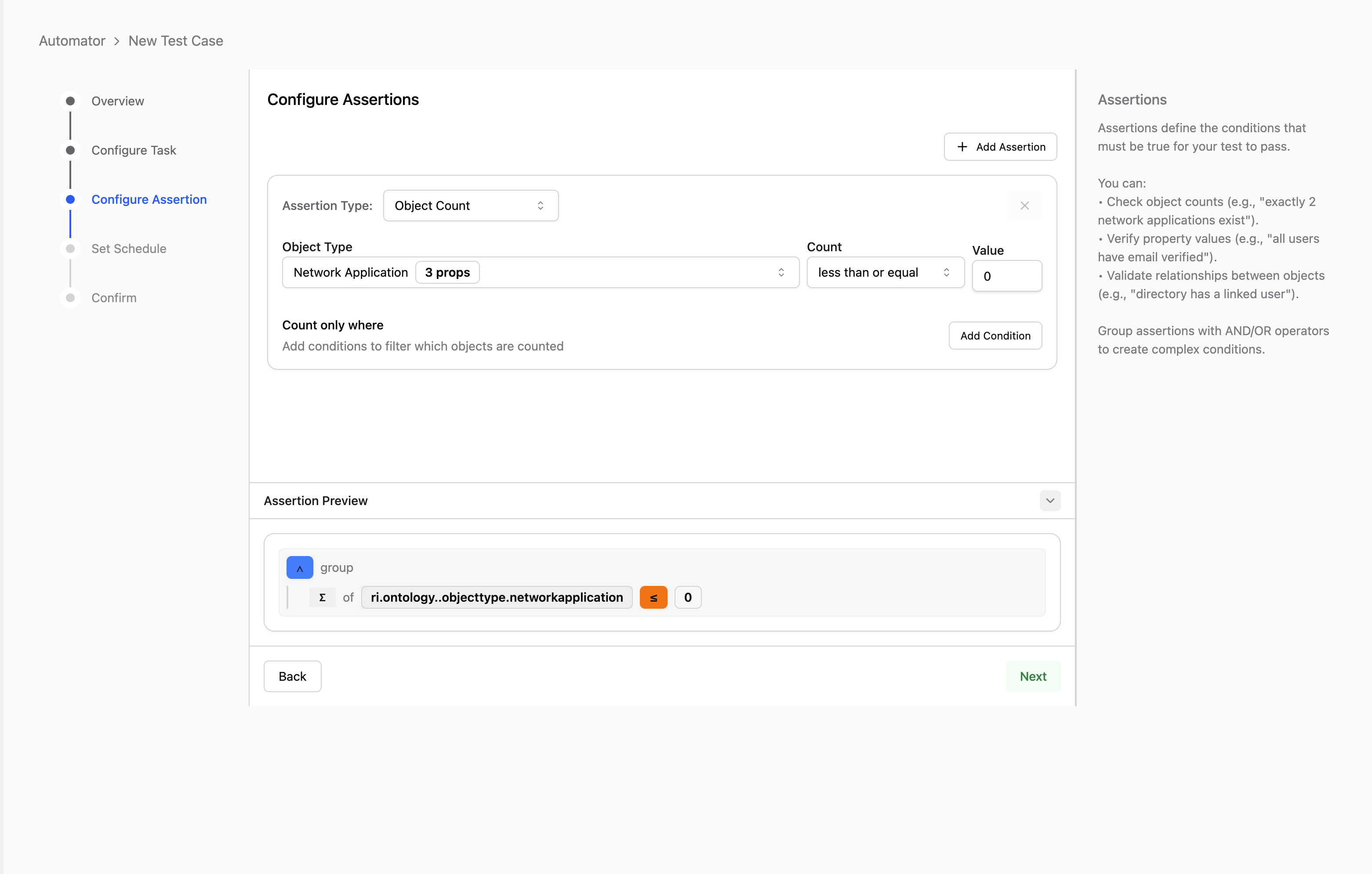 You can also configure assertions to check for Object counts. This checks to see if the number of returned objects looks like you may exepct. For example, if you are running a Test to ensure that network applications are not visible from outside-in, then you might add a check like this below, where you check to confirm that there are no network applications being returned.
