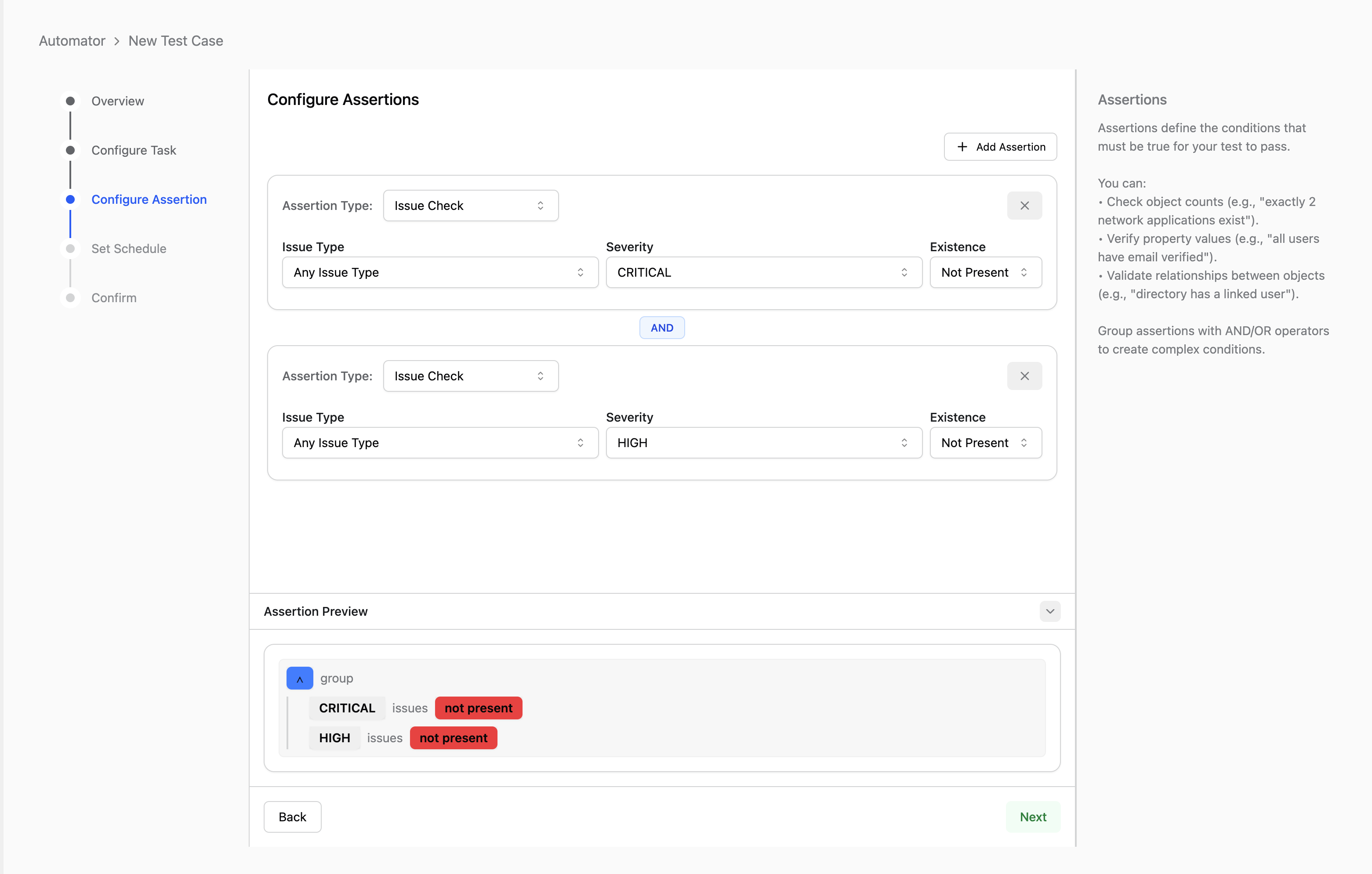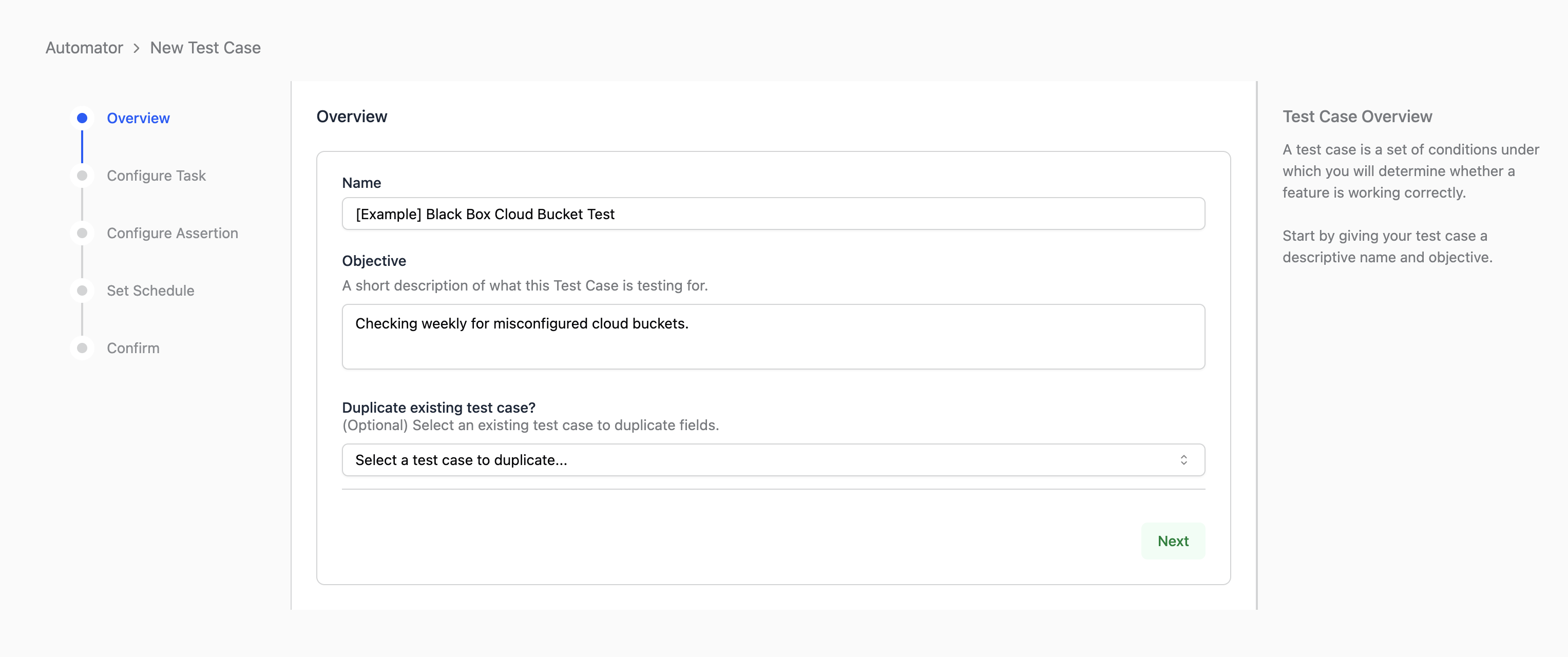Oveview: where you configure metadata like Test Case NameConfigure Task: where you choose an existing Task and configure its inputsConfigure Assertions: where you define the conditions that must be true for your test to pass.Set Schedule: configure when the Test Case should runConfirmation: confirm all details before saving