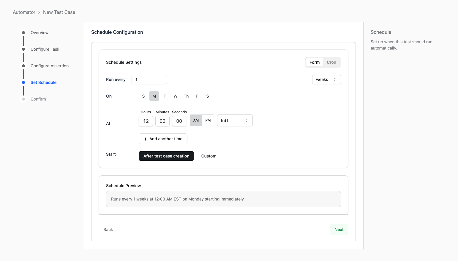 Test Cases have a UI for configuring schedules flexibly. You can optionally switch to using a Cron expression.