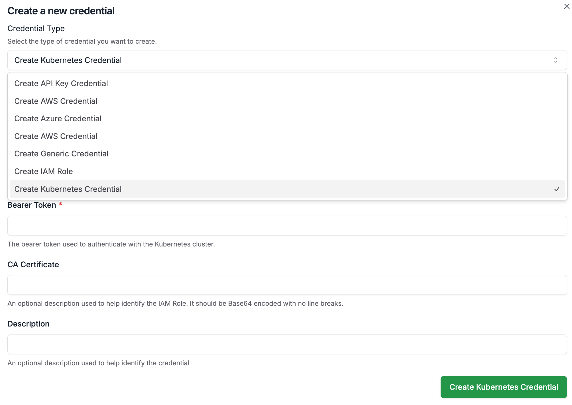 Click the drop down menu and select Create K8s Credential.