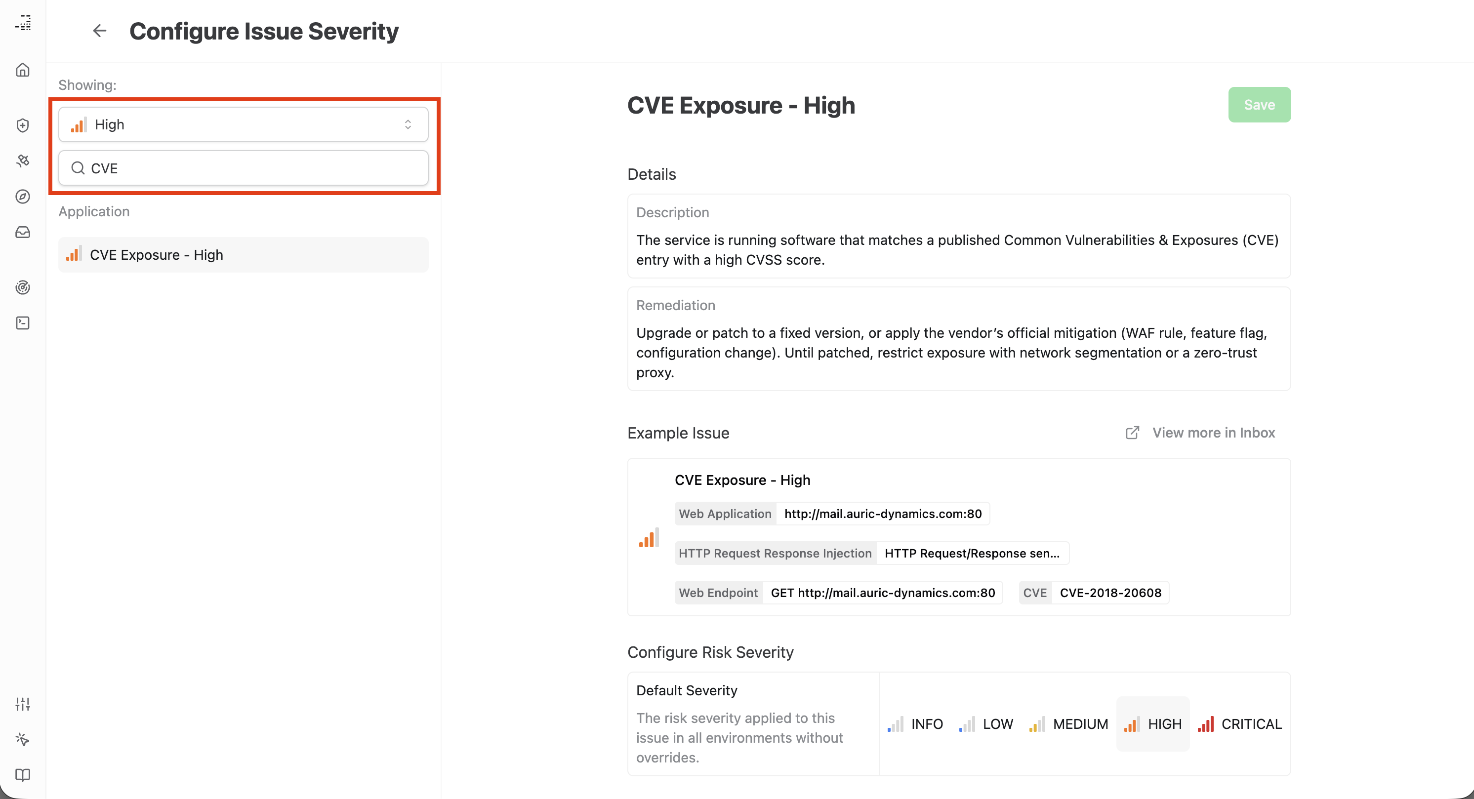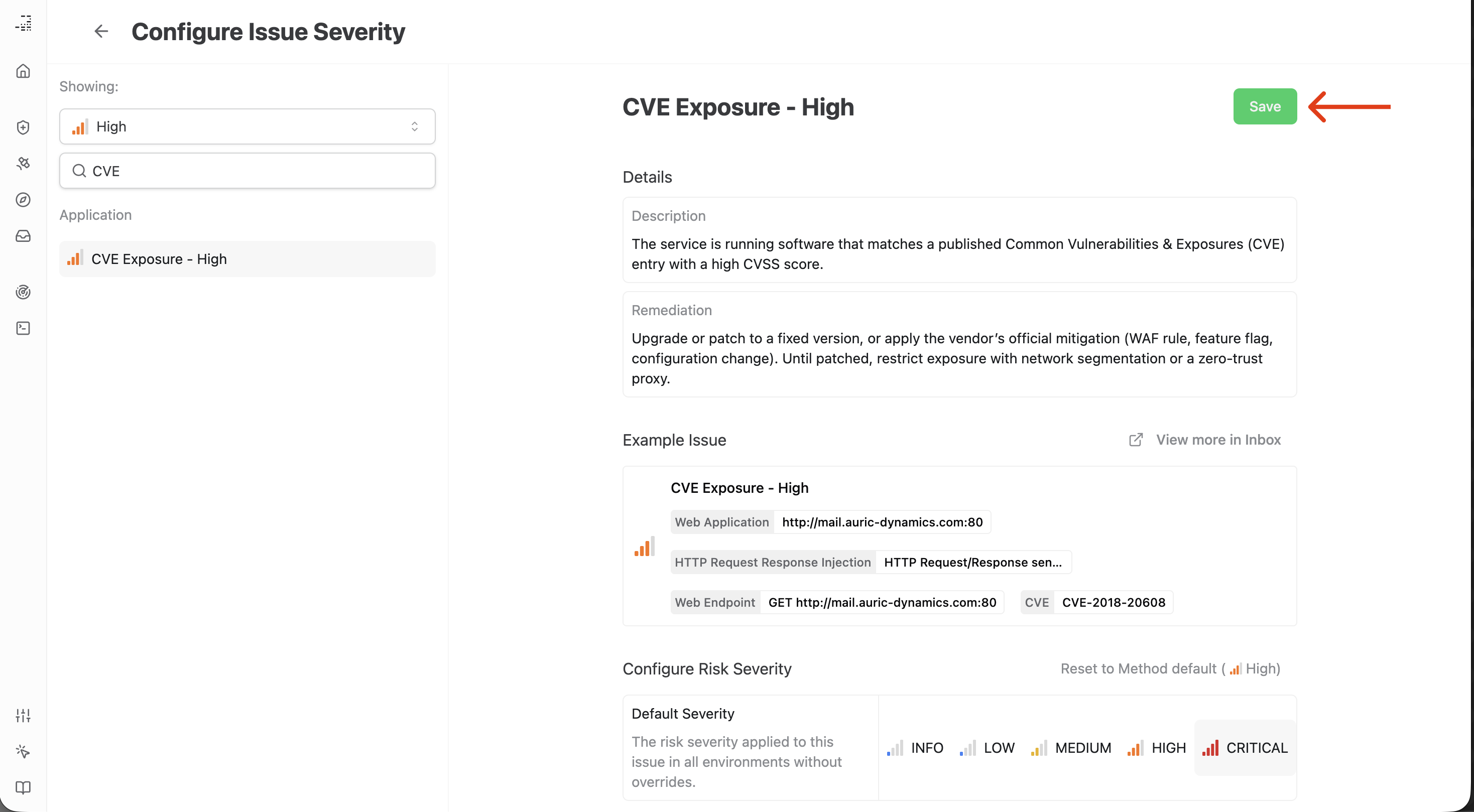 Important: Issue severity overrides only apply when issues are discovered or re-discovered. Changes to severity overrides do not automatically update the severity of existing open issues. The new severity will take effect the next time an issue of that type is found in your environment.
