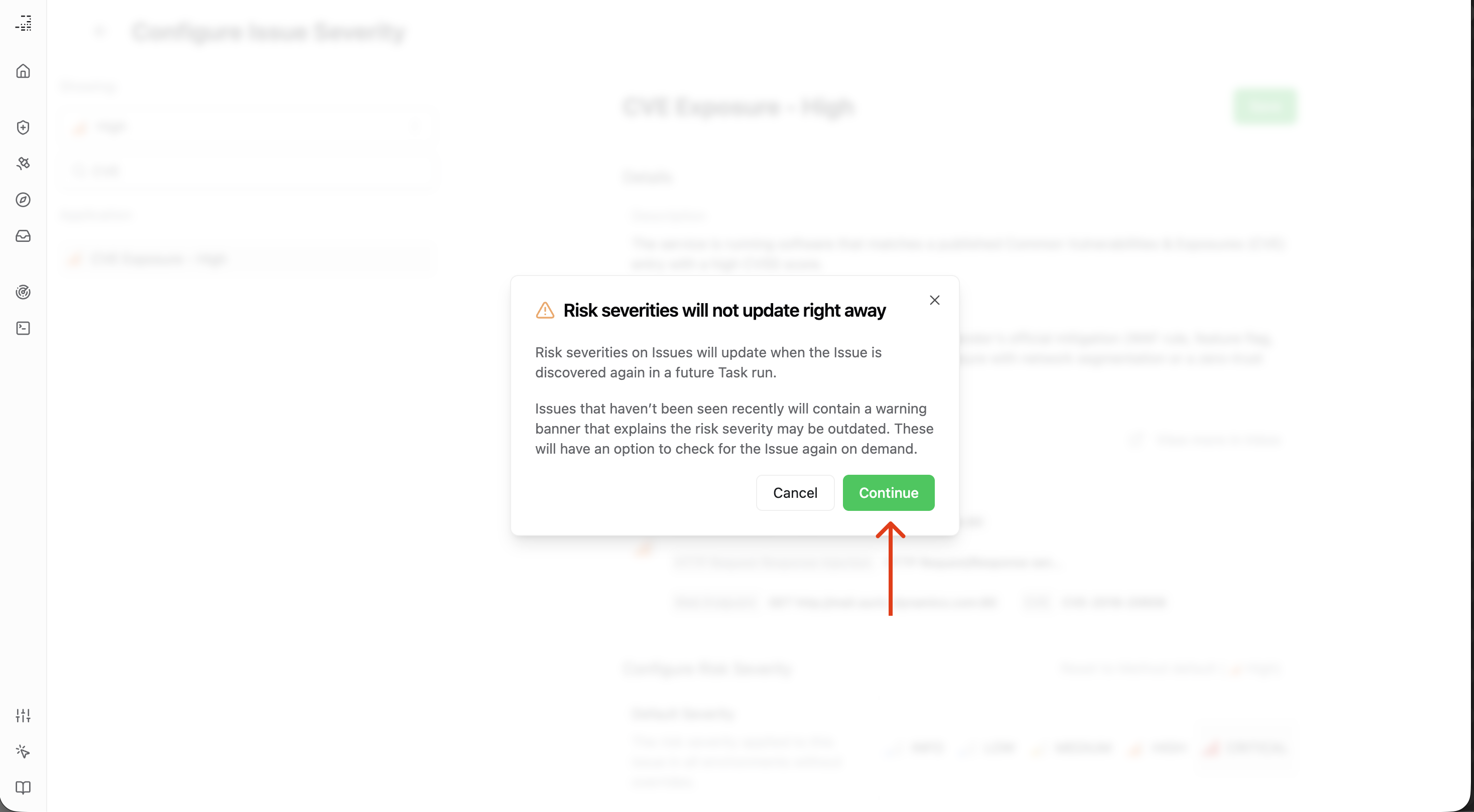 Once confirmed, the global override is active. New instances of this Issue Type will be created with the overridden severity. Existing issues of this type will maintain their current severity until they are re-discovered.