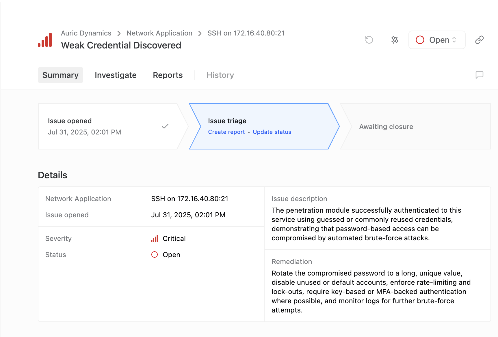 - Issue description and severity