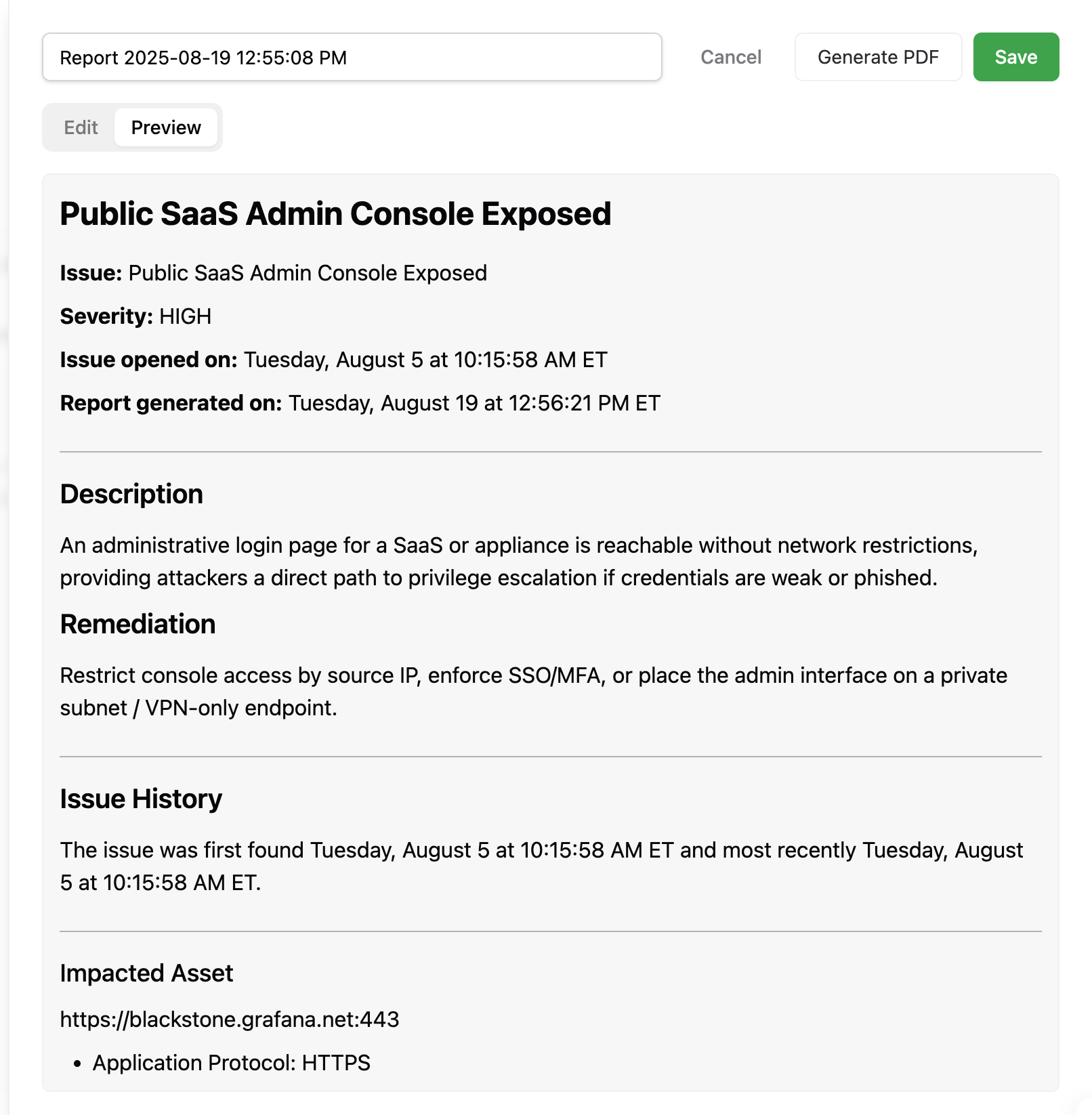 The Reports tab helps you package and share issues with external stakeholders. All issue details are auto-filled in markdown, with space to add more context. The PDF export will generate a report containing: