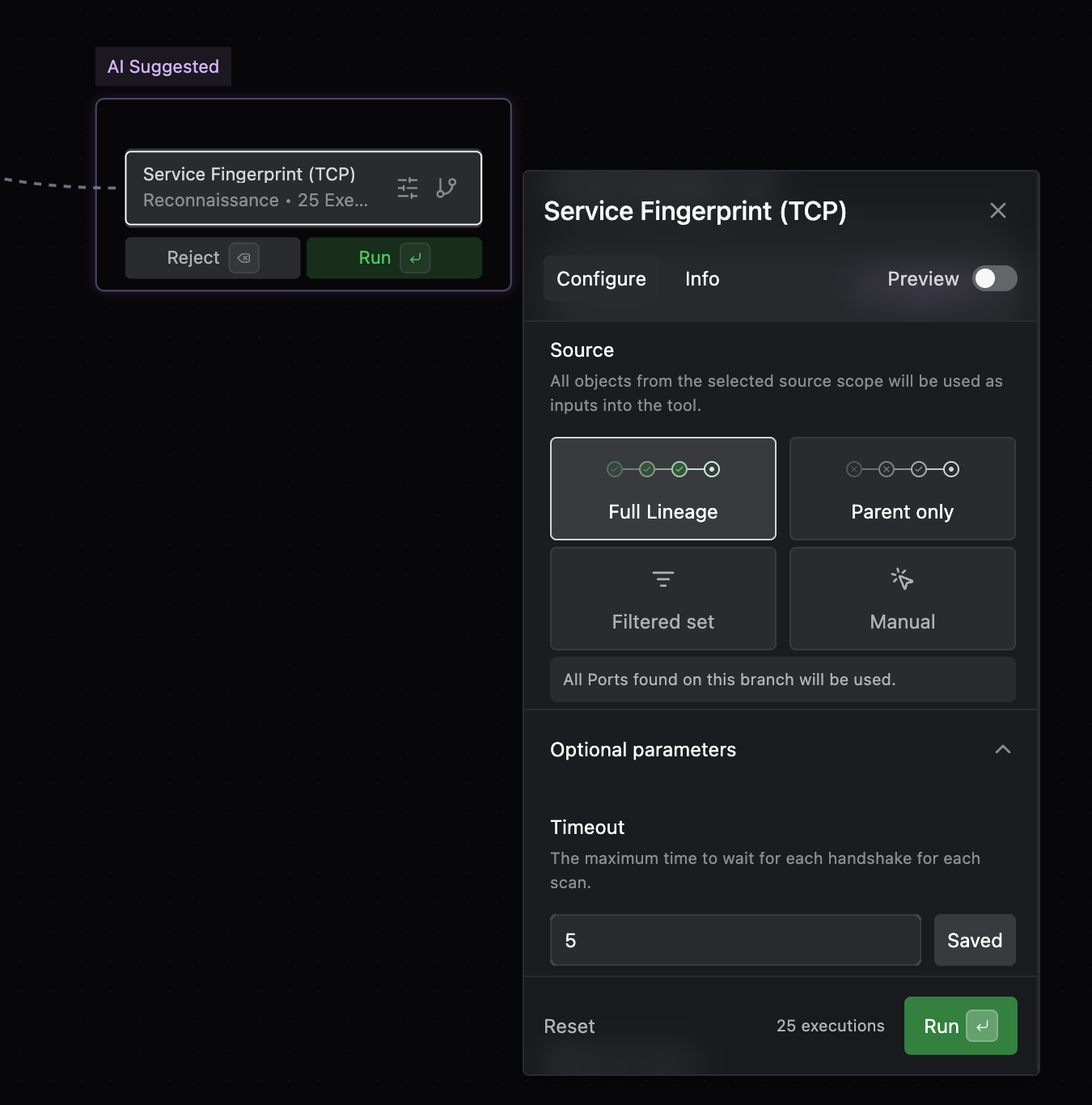 Select Service Fingerprint c. Click and configure the execution; adjust Optional parameter - timeout to be 5, and hit Run.