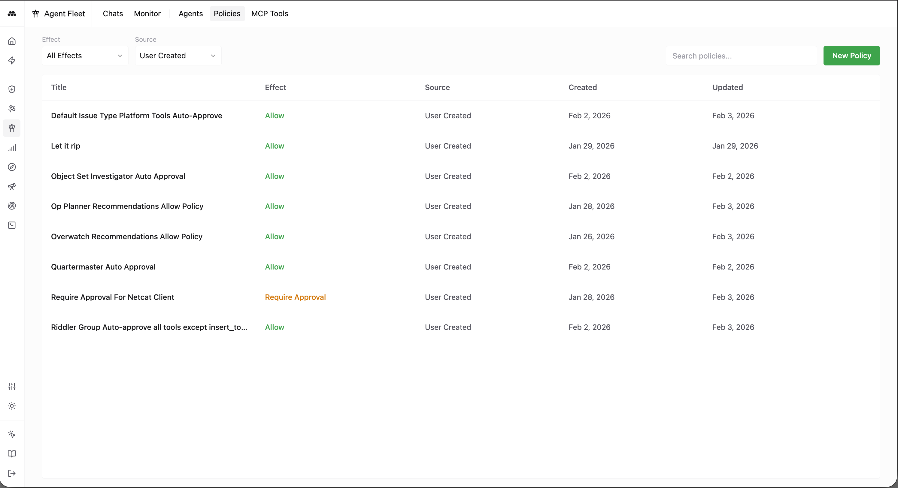 Policies let you govern AI agent behavior in a granular way. You write policies that apply to specific Agents, Environments, MCP Tools, or Agent Sessions. Each policy has an effect: approve, deny, or require approval. Together, these rules determine whether an agent can take an action automatically, is blocked, or must wait for human approval before proceeding.