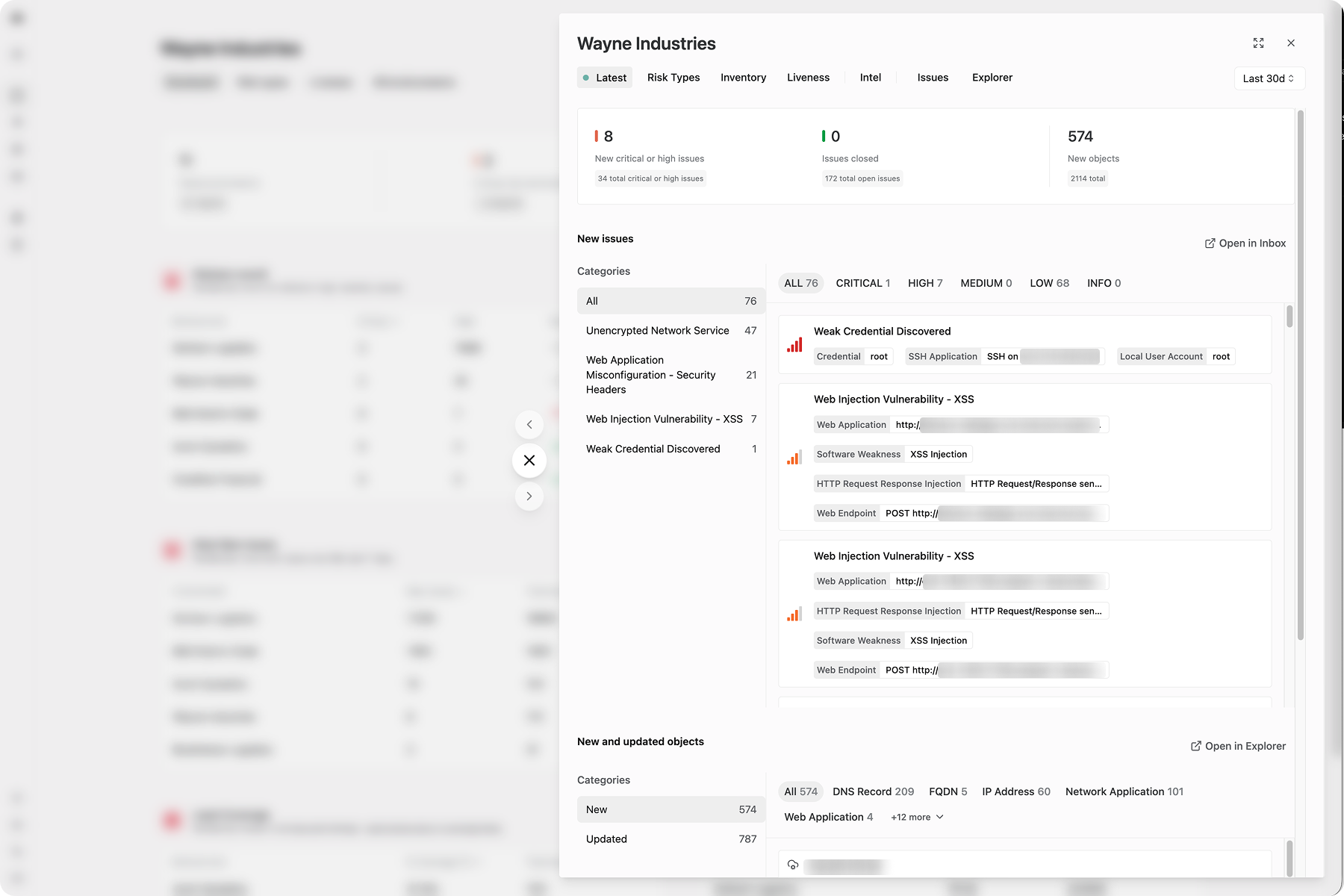Use the newly discovered Issues and Objects to manage changing risks in your environment. Open new issues to validate that they are correct and then triage them to be resolved. Investigate new objects by clicking on them and opening their Object View.