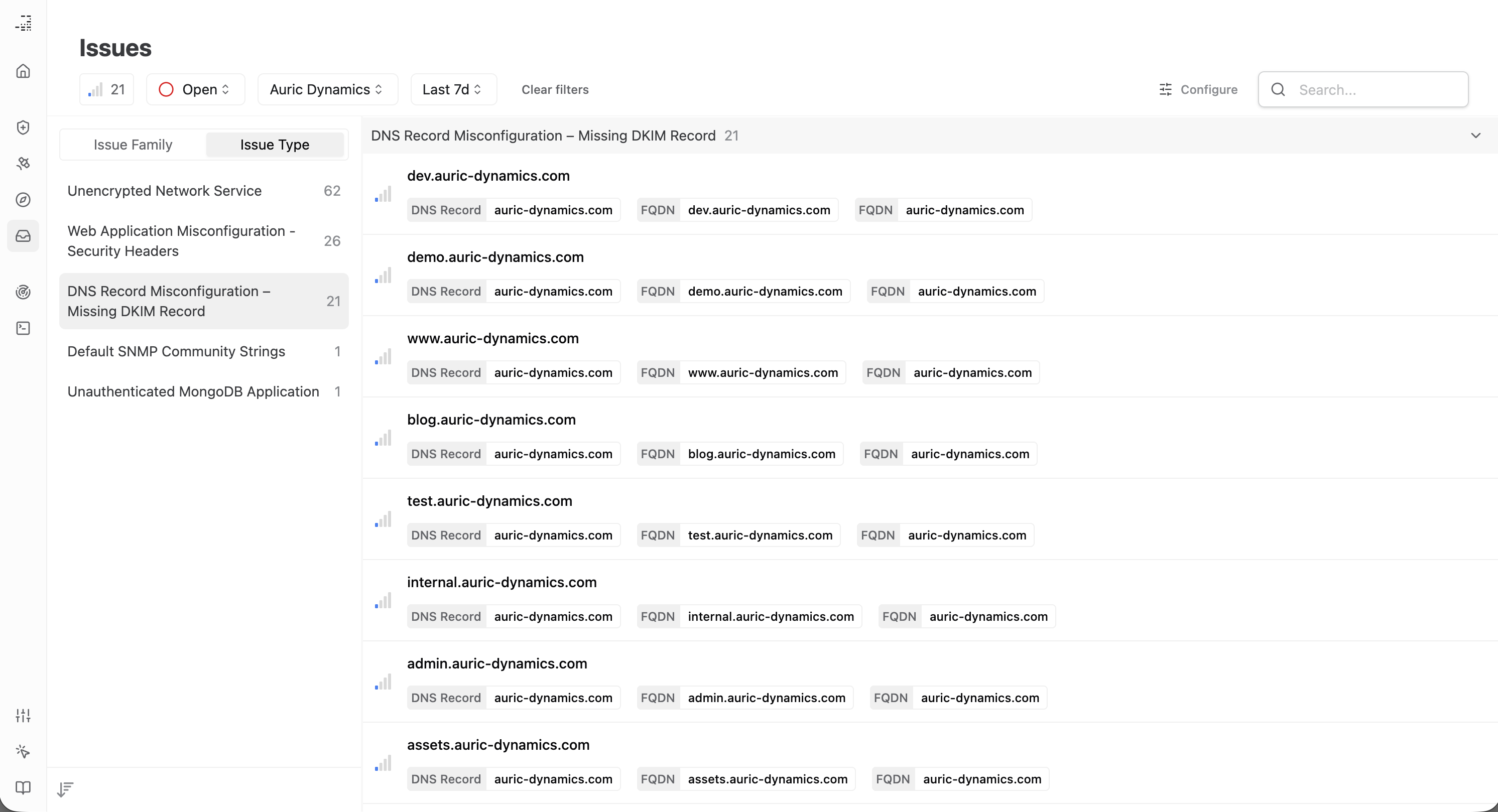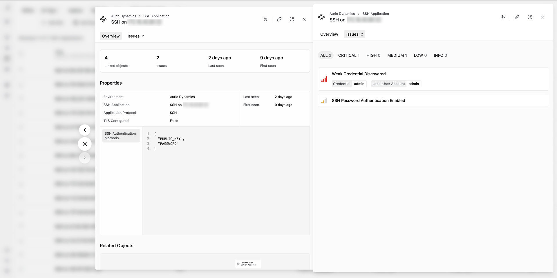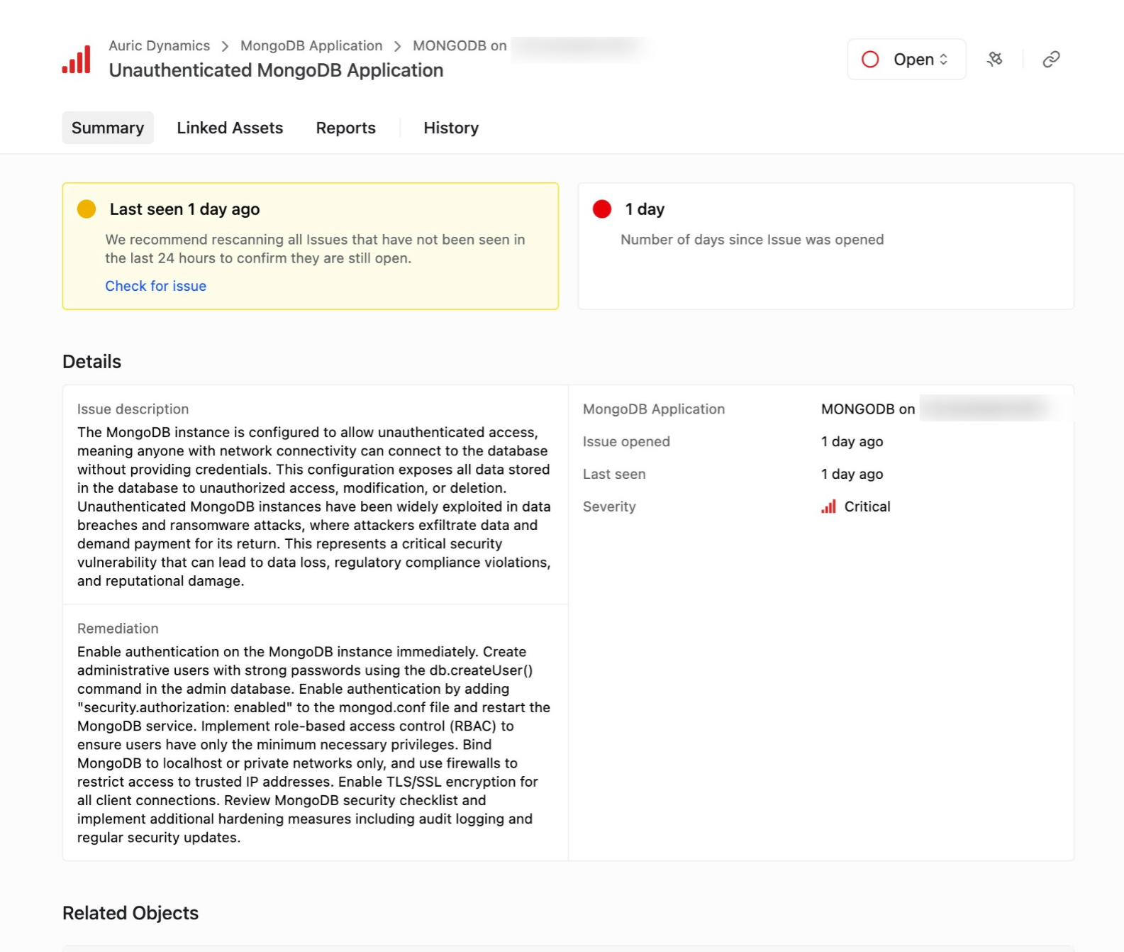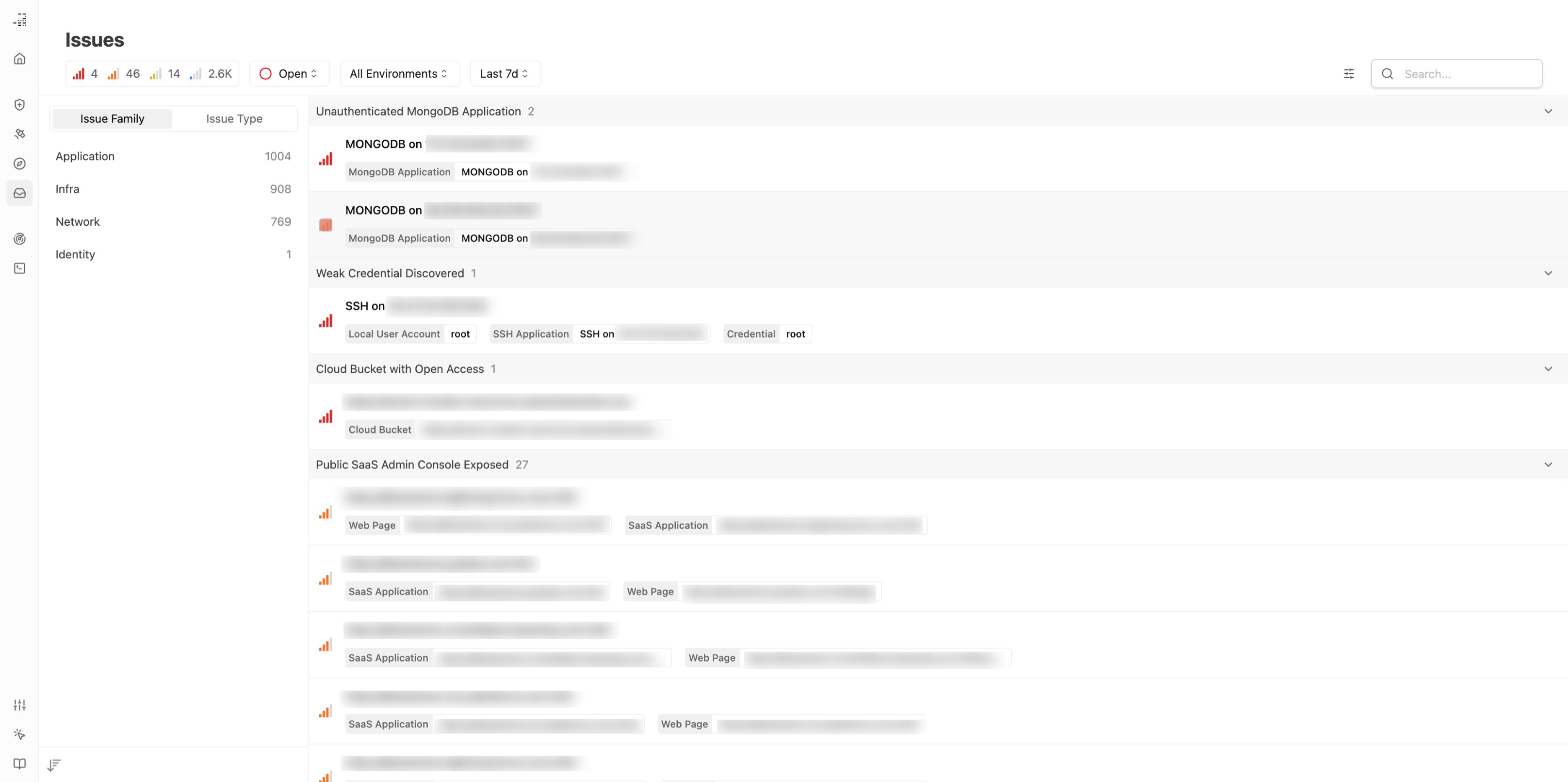 Filter your Issues by family, type, severity, environment, or tag. Every Issue comes with a dedicated Issue View which shows you a description of the Issue, linked assets with a graph showing the relatonships between the impacted assets, a tab to generate reports, and Issue history.