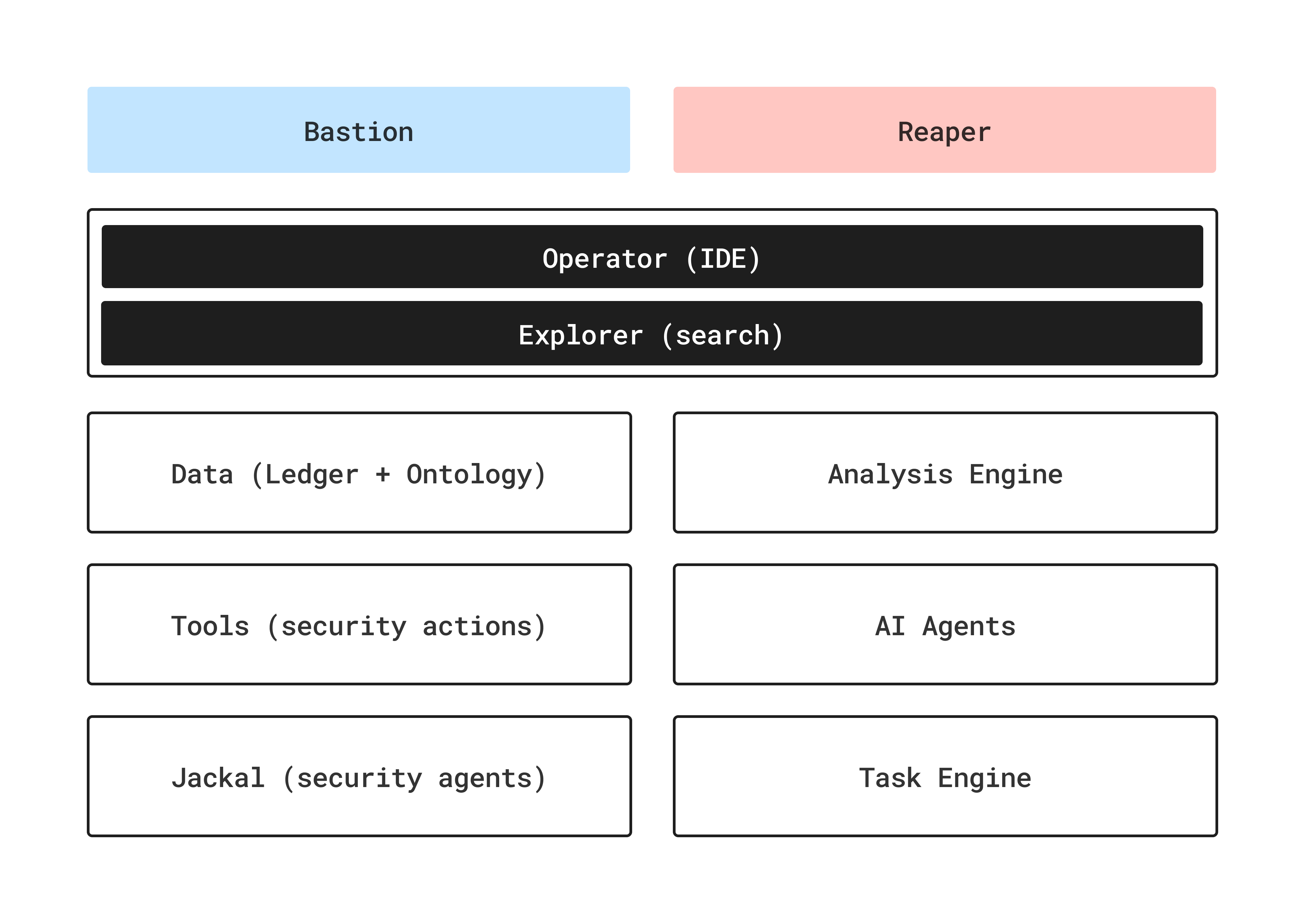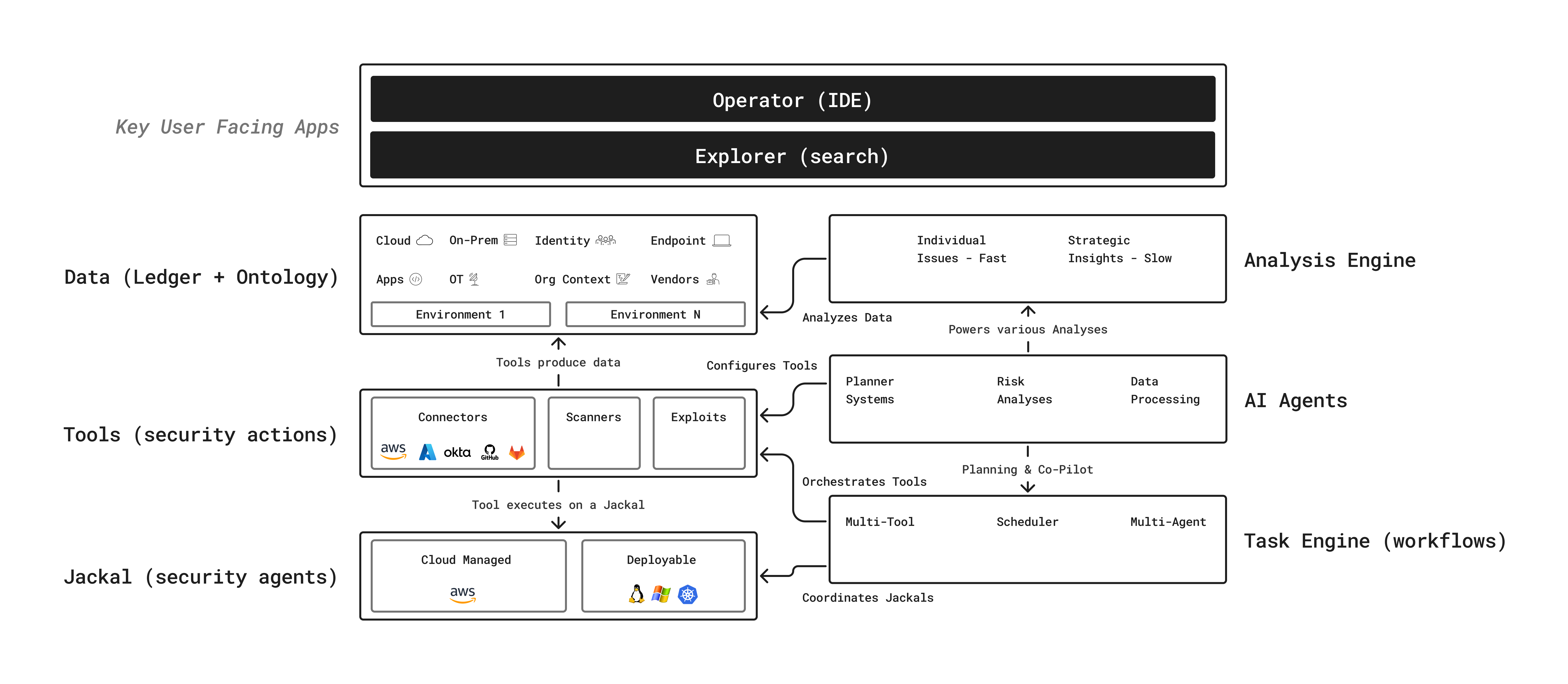 From the bottom up, Jackal (security agents) execute Tools which produce Data. The Task Engine runs workflows which often leverages AI Agents and Analysis Engine. All Primitives together power the ability to use Explorer and Operator. An experience across these Primitives is what are packaged as Products.