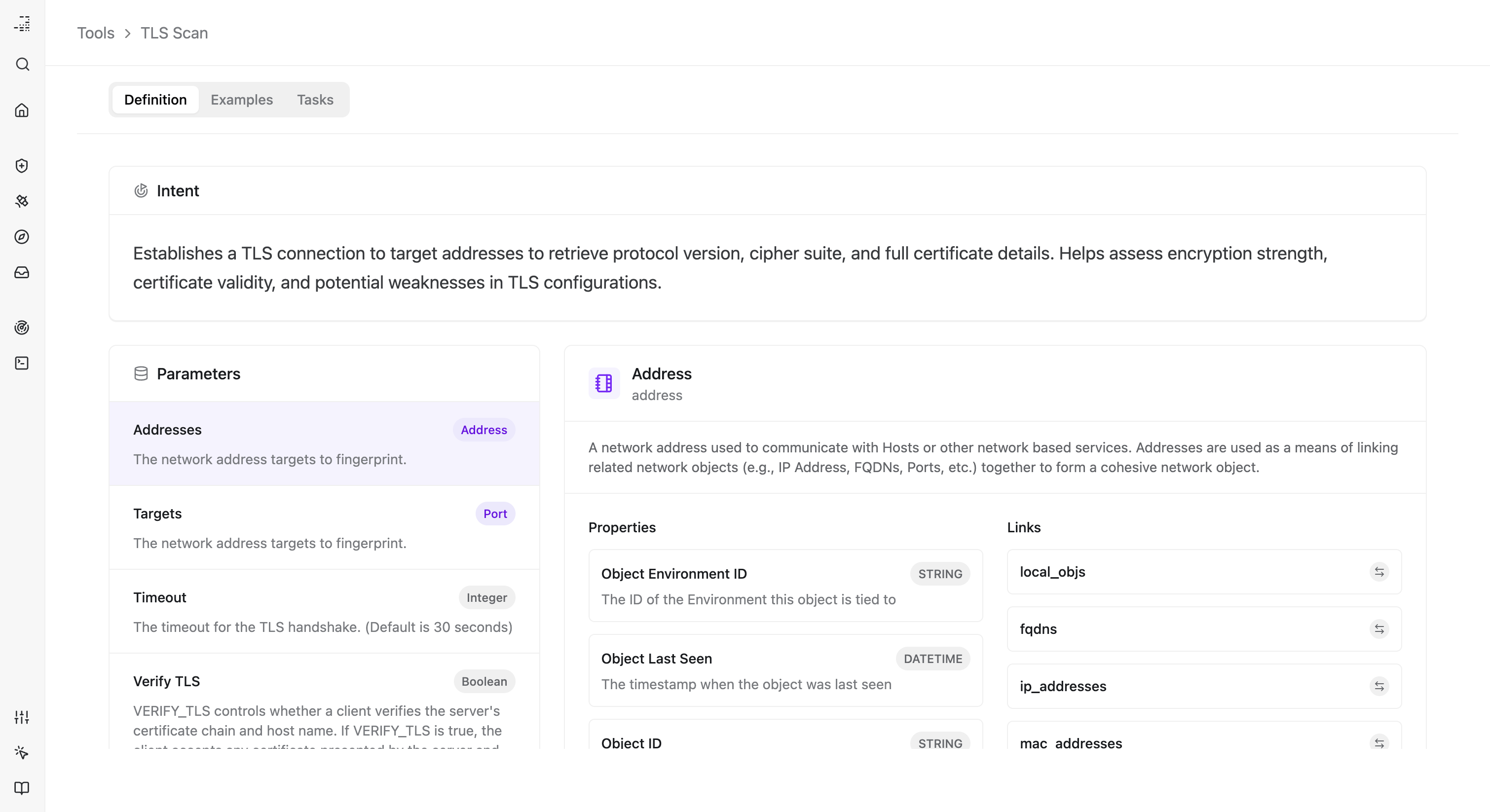 Users can click into a Tool to view details about its purpose, parameters, required inputs, associated links, and the types of Objects it creates. The Examples tab provides sample use cases and representative executions that show how the Tool is used in operations. The Tasks tab displays all existing Tasks that use the selected Tool.