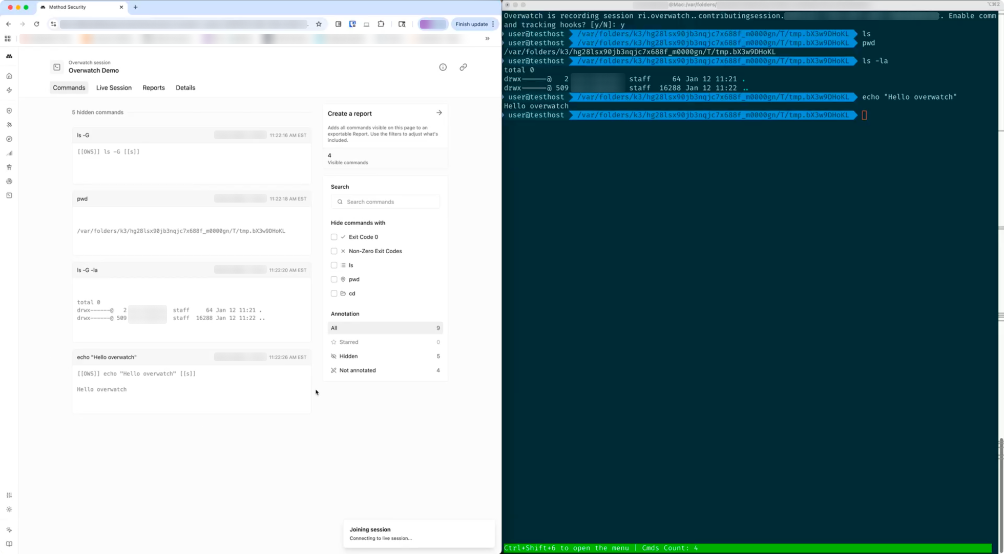 Overwatch records terminal sessions, showing your command history in Method to power an easy search, filtering, and one-click Report generation experience.
